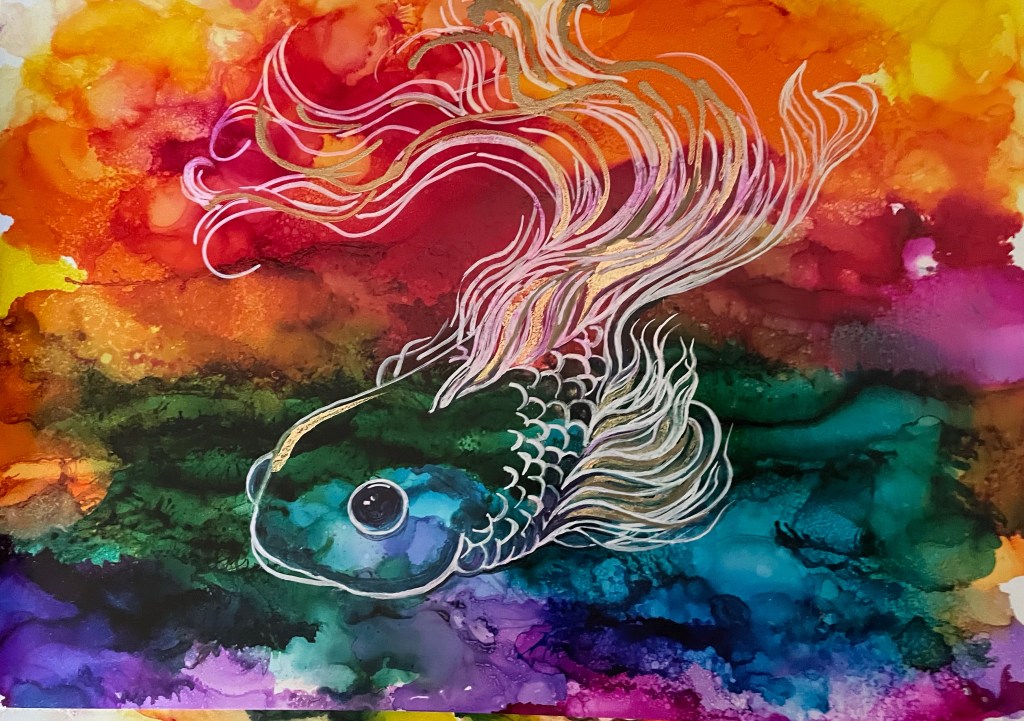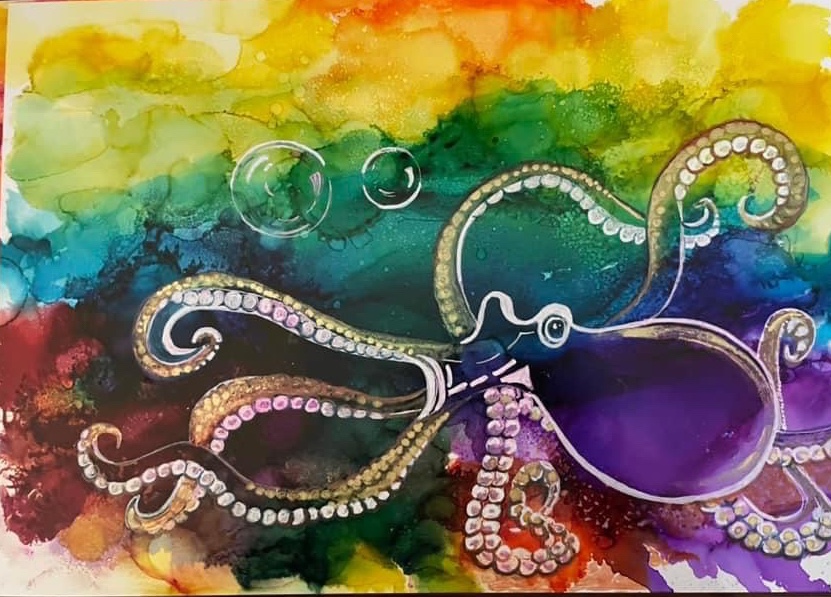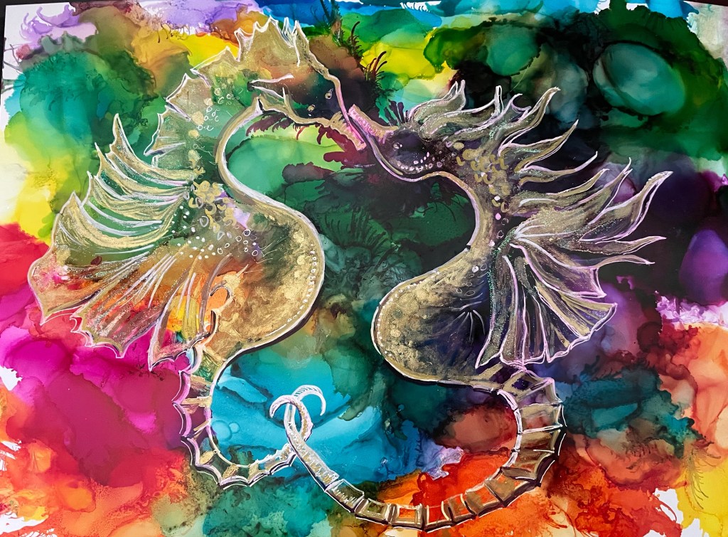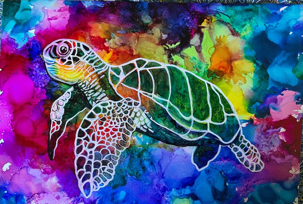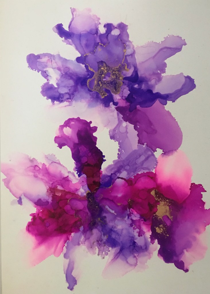 Alcohol ink art is a vibrant art form in which highly pigmented alcohol based dyes are manipulated using isopropyl alcohol, air pressure, sponges, brushes, etc.
